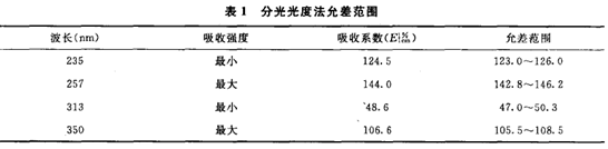 精密稱取在120℃干燥至恒重的基準重鉻酸鉀約60mg,置1000m1量瓶中,用0.005mo1L硫酸液溶解并稀釋至1000m1,用配對的1 cm石英池,以0.005mo1L硫酸液為空白,在235,257,313,350nm分別測定吸光度,然后換算成E,測得值應(yīng)符合表1中規(guī)定的允差范圍。