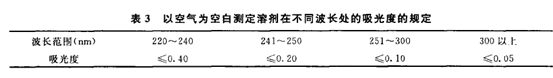 4.含有雜原子的有機溶劑,通常均具有很強的末端吸收。因此,當(dāng)作溶劑使用時,它們的使用范圍均不能小于截止使用波長。例如甲醇、乙醇的截止使用波長為205nm。另外,當(dāng)溶劑不純時,也可能增加干擾吸收。因此,在檢查所用的溶劑在供試品所用的波長附近是否符合要求,即將溶劑置1 cm石英吸收池中,以空氣為空白(即空白光路中不置任何物質(zhì))測定其吸光度,溶劑和吸收池的吸光度應(yīng)符合表3規(guī)定。